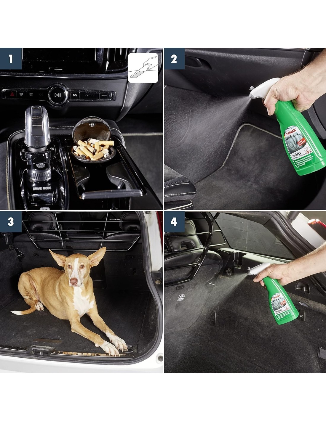 ¿Sufres de olor a cigarrillo en el coche y quieres eliminarlo? El ambientador SONAX SmokeEx elimina el mal olor a cigarrillo, ceniza y nicotina del coche. El ambientador penetra profundamente en la tapicería de tela del coche, en el asiento del coche o en otras zonas, después de lo cual elimina completamente el olor desagradable. El coche vuelve a oler fresco y como nuevo.