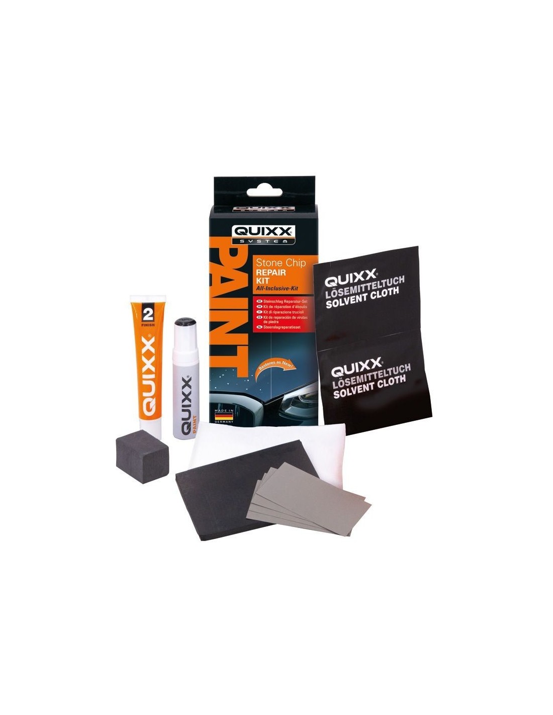 Quixx Stone Chip Repair Kit / Kit de reparación de Stone Chip: para pinturas negras de automóviles No se pueden evitar las virutas de piedra en la pintura del capó y el parachoques delantero, especialmente cuando se conduce por la carretera. Cuanto más oscuro sea el color de la pintura, más presentes serán las virutas blancas. Las virutas profundas que penetran la capa de pintura hasta el metal pueden provocar corrosión. Repintar una campana completa es costoso y requiere mucho tiempo. Gracias al Kit de reparación de virutas de pintura QUIXX, las ranuras antiestéticas y los daños menores en la pintura de la parte delantera de su automóvil se eliminarán en poco tiempo. Este producto ayuda a evitar costosas reparaciones de repintado y respalda la retención de valor a través de una solución sencilla que puede realizar usted mismo. BENEFICIOS: - Reparación de bricolaje con virutas de piedra de calidad profesional - Adecuado para la mayoría de las virutas y daños en la carrocería de vehículos planos - Desarrollado y utilizado por reparadores - Ahorra en reparaciones costosas y ayuda a mantener el valor - El kit todo incluido incluye todo lo que necesita ESPECIALES: - Elija entre 4 barras de pintura de diferentes colores: negro, rojo, plateado, blanco - El juego también está disponible sin barra de pintura Kit todo incluido: - 1 barra de pintura - 2 bolsas con un paño de gasa empapado en una solución especial - 1 limpiador de goma especial - 4 papel de lija, grano 3000 - 1 bloque de lijado - 1 tubo de abrillantador especial acabado QUIXX - 3 paños de limpieza - 1 par de guantes - 1 juego de instrucciones