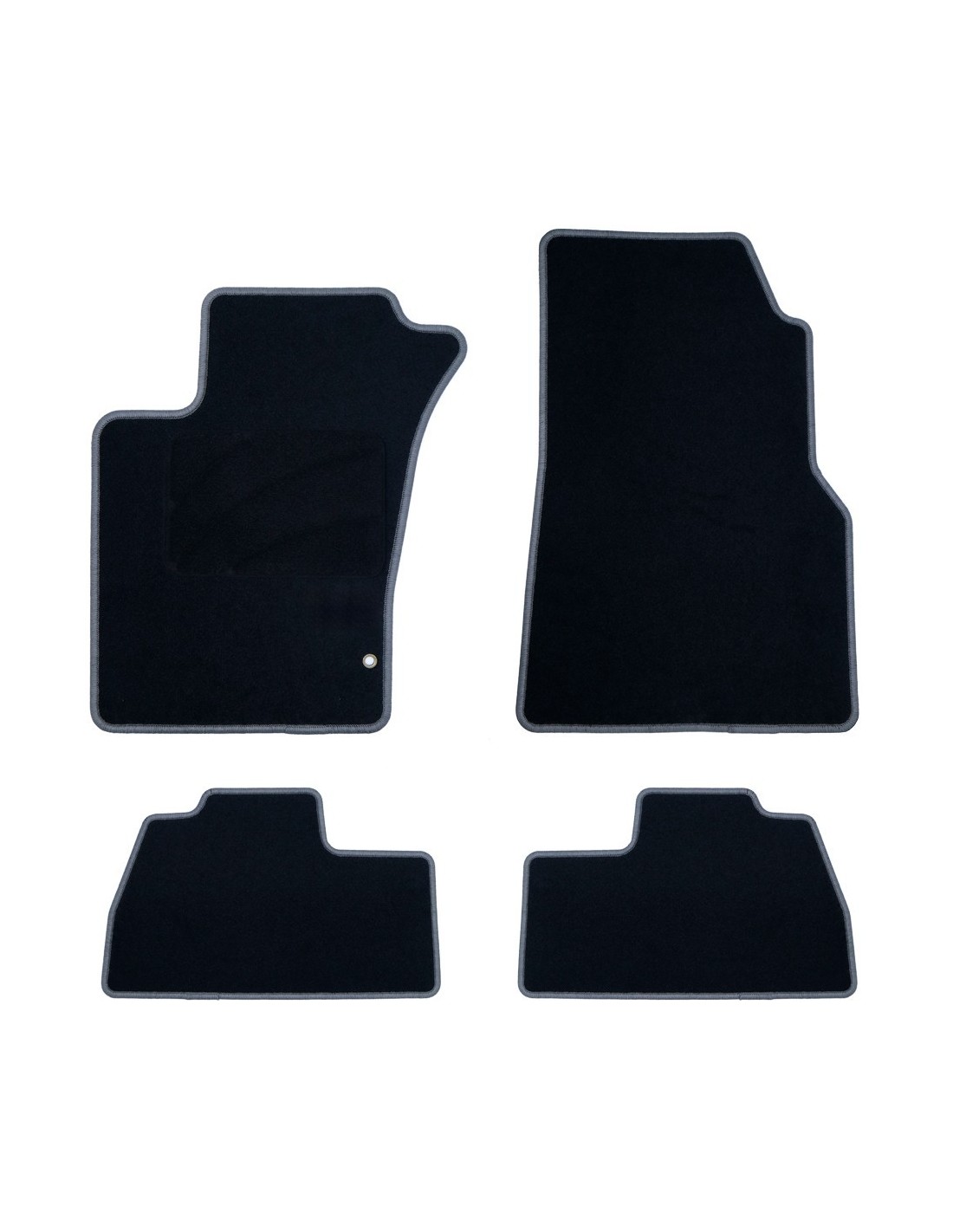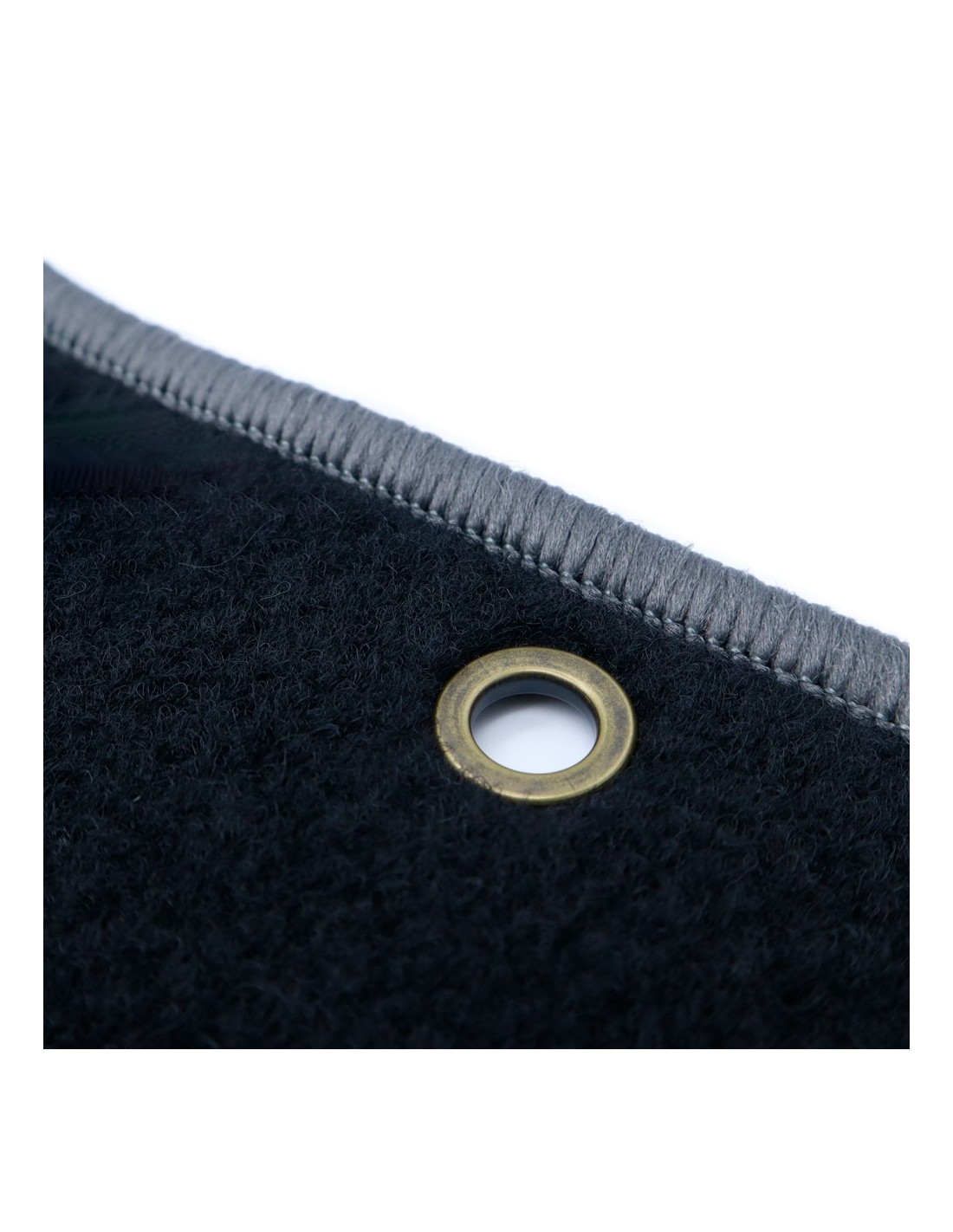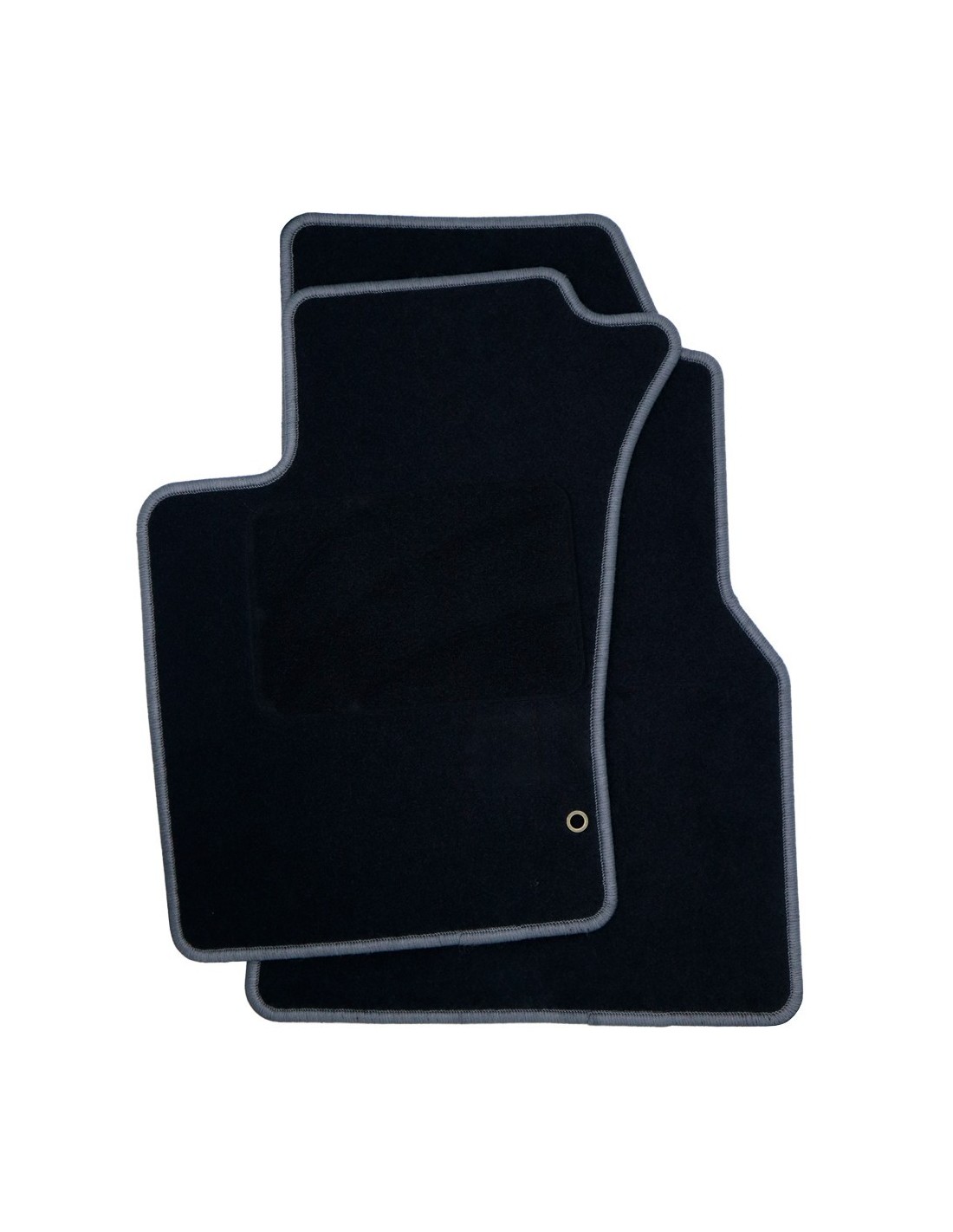 DISEÑO: Alfombras para el coche con el sistema de anclaje original redondo. El emblema y el ribete (de color gris oscuro) están completamente bordados en velour.