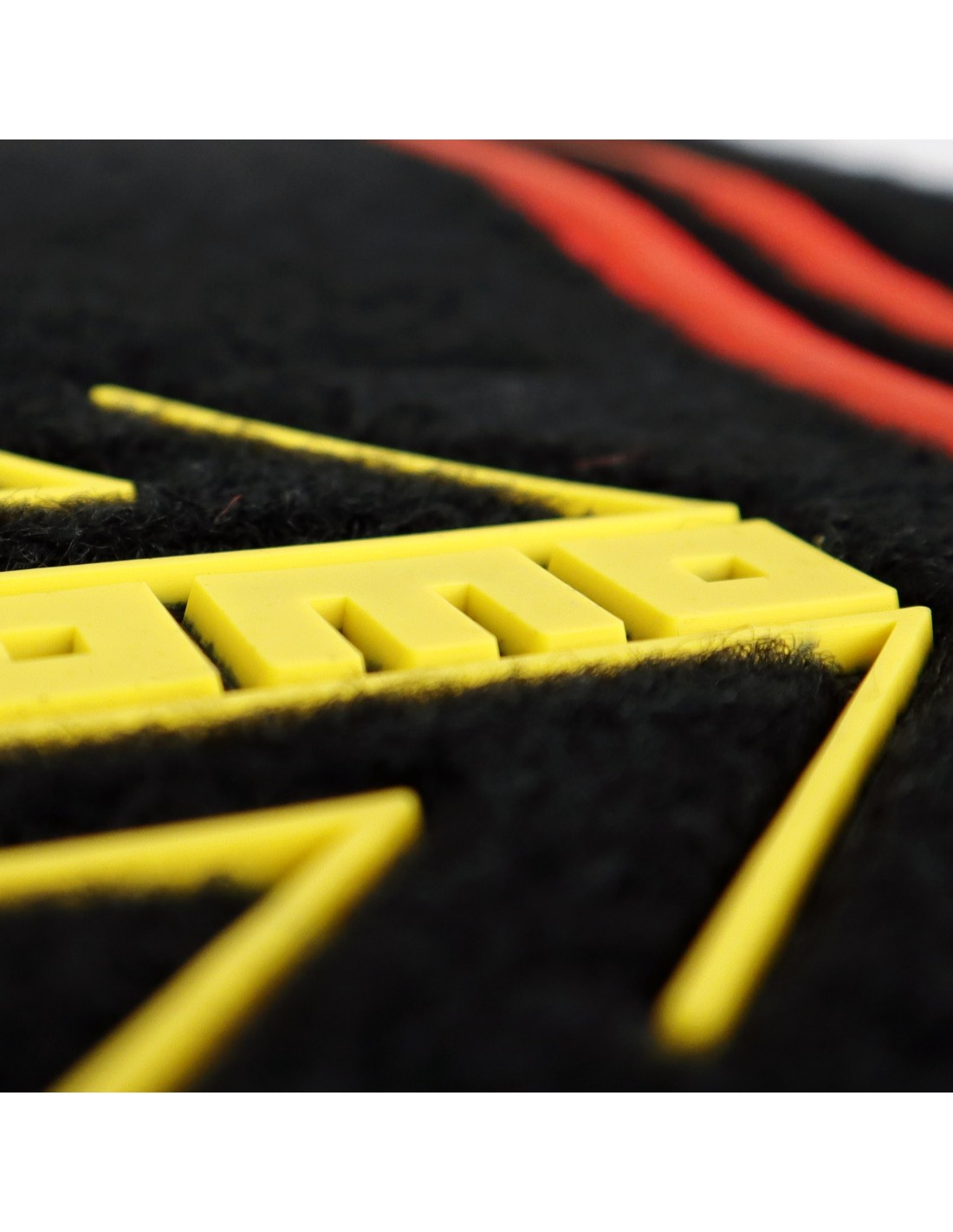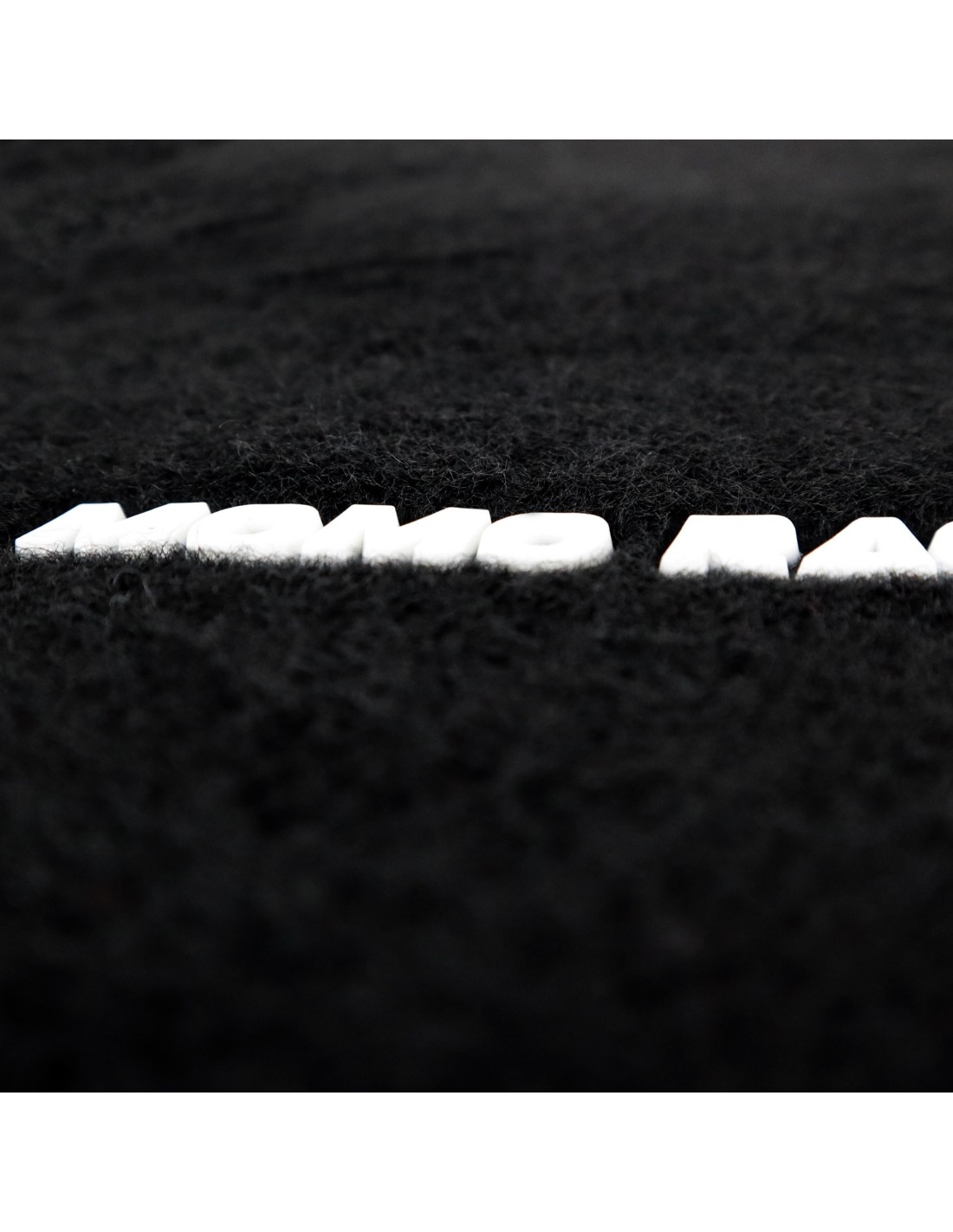 DISEÑO: Alfombrillas para coche con diseño en moqueta negra, costuras en blanco y talonera reforzada en la alfombra del piloto con el logo MOMO en blanco. Llevan también el logo MOMO en las alfombras delanteras en amarillo (en la parte inferior), la frase MOMO RACING TEAM en horizontal en blanco y los bordes y franjas verticales en rojo.