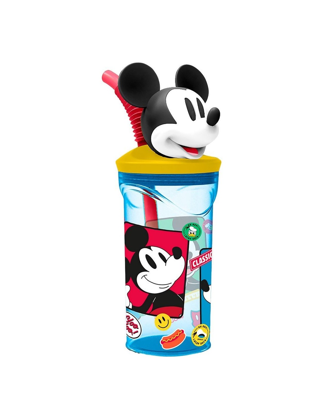 Capacidad: 360 ml, apto para niños a partir de 4 años. Material: Plástico alimentario reciclable (libre de BPA), no lavable en lavavajillas y no apto para hornos microondas, las pajitas y los vasos son completamente lavables y reutilizables. Vaso con pajita integrada y personaje 3D Altura: 23 cm, Diámetro: 7,5 cm, Peso: 92 gr Fácil de limpiar, con gráficos de Mickey Mouse, licencia oficial Disney