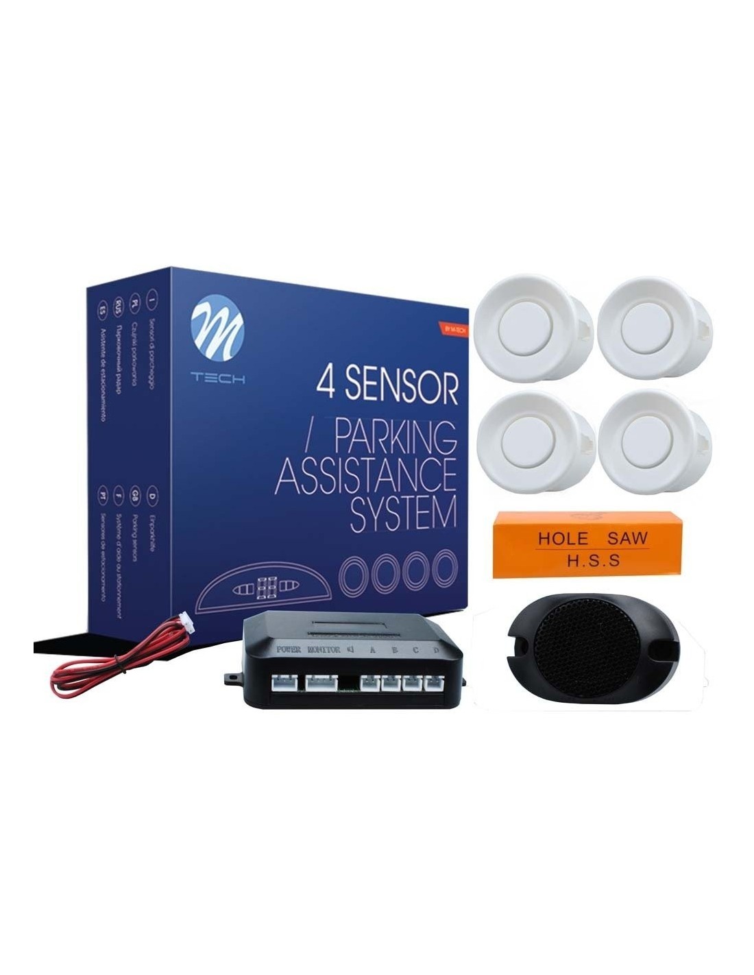?Sistema de Aparcamiento Asistido con 4 sensores y zumbador BLANCOEl sistema sencillo y funcional enciende automáticamente al iniciar la maniobra de marcha atrás. Los sensores ultrasónicos fijados en el parachoques del vehículo calculan la distancia al obstáculo. El zumbador le notifica al conductor de la presencia del obstáculo emitiendo el sonido intermitente creciente.Los sensores están disponibles en tres colores diferentes.Todos los sensores de aparcamiento presentes en la oferta M-Tech se caracterizan por un ratio de avería bajo y sencillez del montaje sin requisito de la visita en el taller de reparación. Se pueden laquear los sensores con el color del vehículo sin impacto en su funcionamiento.El kit contiene:- 4 sensores blancos- Zumbador- Unidad de control electrónico- Cableado- Taladro con sierra de corona- Elementos de fijación- Manual de usuarioEspecificaciones:Diámetro de sensores: 21,5 mmSuministro de energía: 12V DC Consumo de potencia: < 4W Frecuencia ultrasónica de sensores: 40 KHz Temperatura de funcionamiento: de -30 C a +70°C Error de cálculo: +/- 5cm Ángulo de inclinación del parachoques admisible: +/- 5°