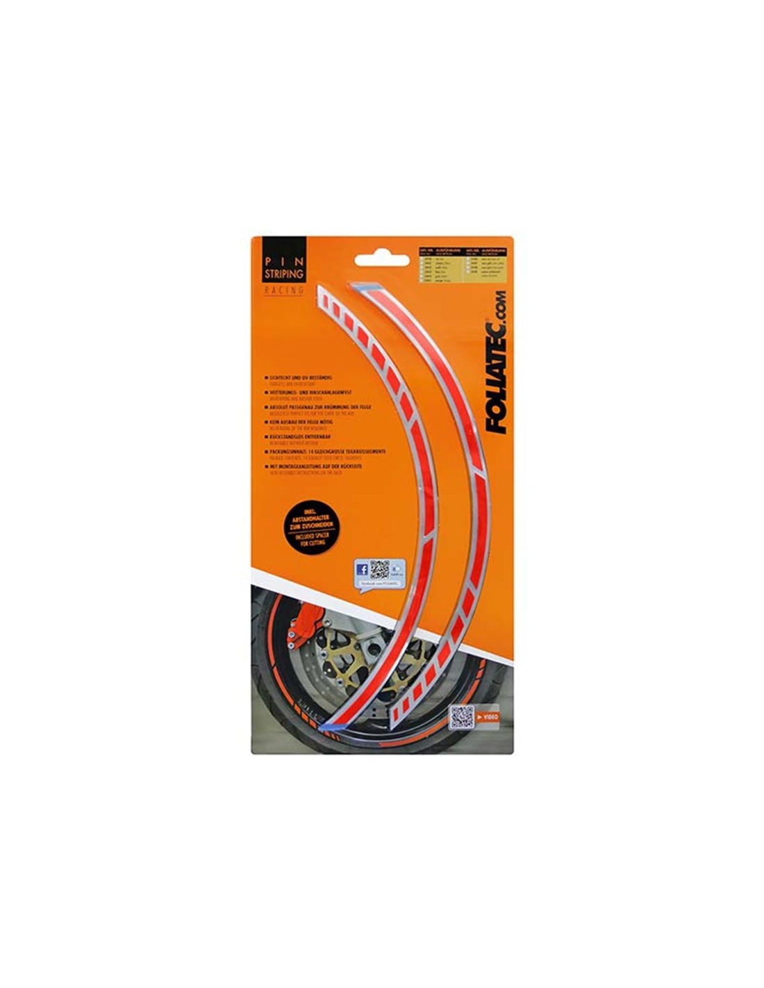 INFORMACIÓN DEL PRODUCTO Dale a tu bicicleta un toque fresco y deportivo con PIN Striping Racing. Las tiras del borde son fáciles de aplicar y se adaptan perfectamente a la curva del aro. autoadhesivo sin brillo y resistente a los rayos UV a prueba de intemperie y arandela no se requiere la eliminación de la llanta extraíble sin residuos ancho: 6 mm Contenido del paquete: 14 segmentos circulares del mismo tamaño (3 tiras por cada lado del, más 1 tira de reserva por lado), patrón espaciador 17 '' para la aplicación APLICACION Preparación: Las ruedas deben estar secas, limpias y sin grasa ni cera. Para el desengrase recomendamos las toallitas de limpieza FOLIATEC.com. La temperatura ideal de aplicación es de 20 grados Celsius. Aplicación: retire el papel del transportista. Aplique 3 tiras simples por lado de la llanta en la distancia correcta. Para hacer esto, use el patrón de espaciador incluido. Después de aplicar, presione las tiras firmemente. Luego retire la hoja de transferencia con cuidado. Para un buen acabado presione las tiras de nuevo con un paño suave. ? Remoción: Caliente las tiras con un secador de pelo. Levante las tiras en una esquina y sáquelas lentamente. Nota: El PIN Striping Racing de FOLIATEC.com logra su fuerza adhesiva completa después de 12 horas. La adherencia puede reducirse debido a superficies ásperas, mate o recubiertas.
