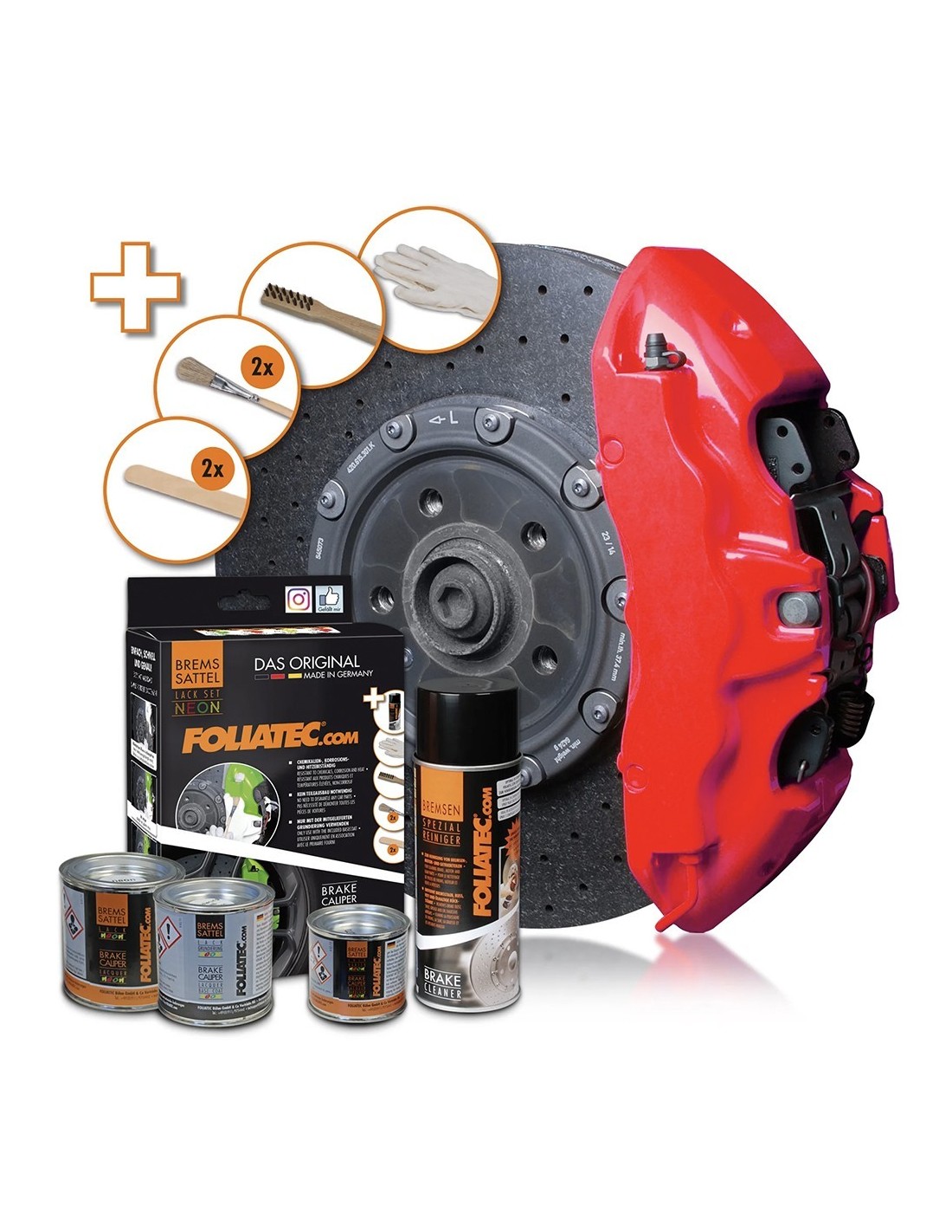 INFORMACIÓN DEL PRODUCTO Con la pinza de freno y la pinza de freno NEON le da a su vehículo un aspecto muy individual y deportivo. Sella y conserva permanentemente la superficie y es resistente a productos químicos, a la corrosión y al aceite. Tiene un brillo duradero y es fácil de limpiar. Con la capa base incluida, nuestra pinza de freno NEON muestra una luminosidad extremadamente intensa. Juego de 7 piezas o 10 piezas (para colores NEON) resistente al calor resistente a productos químicos, a la corrosión y al aceite aplicación fácil y exacta con un pincel no hay necesidad de desmontar ninguna pieza de automóvil suficiente para 4 pinzas de freno Use colores NEON solo con la capa base incluida CONSEJO: ahora también aplicable con una pistola de pintura debido a nuestra nueva dilución. El juego de laca Pinza de freno incluye: Limpiador de frenos, pintura de 400 ml y 125 ml, así como 50 ml de endurecedor Cepillo de acero, cepillo, espátula, 1 par de guantes desechables El juego de pinza de freno NEON incluye: Limpiador de frenos (400 ml) + Basecoat (125 ml) + laca (125 ml) + endurecedor (50 ml) 1 cepillo de acero, 2 cepillos, 2 espátulas, 1 par de guantes desechables APLICACION Retire las ruedas. Limpie la pinza del freno con el cepillo de acero incluido y el Limpiador de frenos incluido. Mezcle la pintura de la pinza de freno y el agente de endurecimiento con la espátula. Para colores NEON: Agite la capa base blanca con la espátula y aplique en una capa delgada pero bien cubierta con el primer pincel fino. Use la segunda espátula para mezclar la pintura de la pinza de freno NEON y el agente de endurecimiento. Enmascare todas las piezas excepto la pinza de freno y aplique la pinza de freno con el pincel. Después de pintar las pinzas de freno déjelos secar, luego coloque la rueda en su lugar, listo. Para obtener más instrucciones, lea la hoja de APLICACION.
